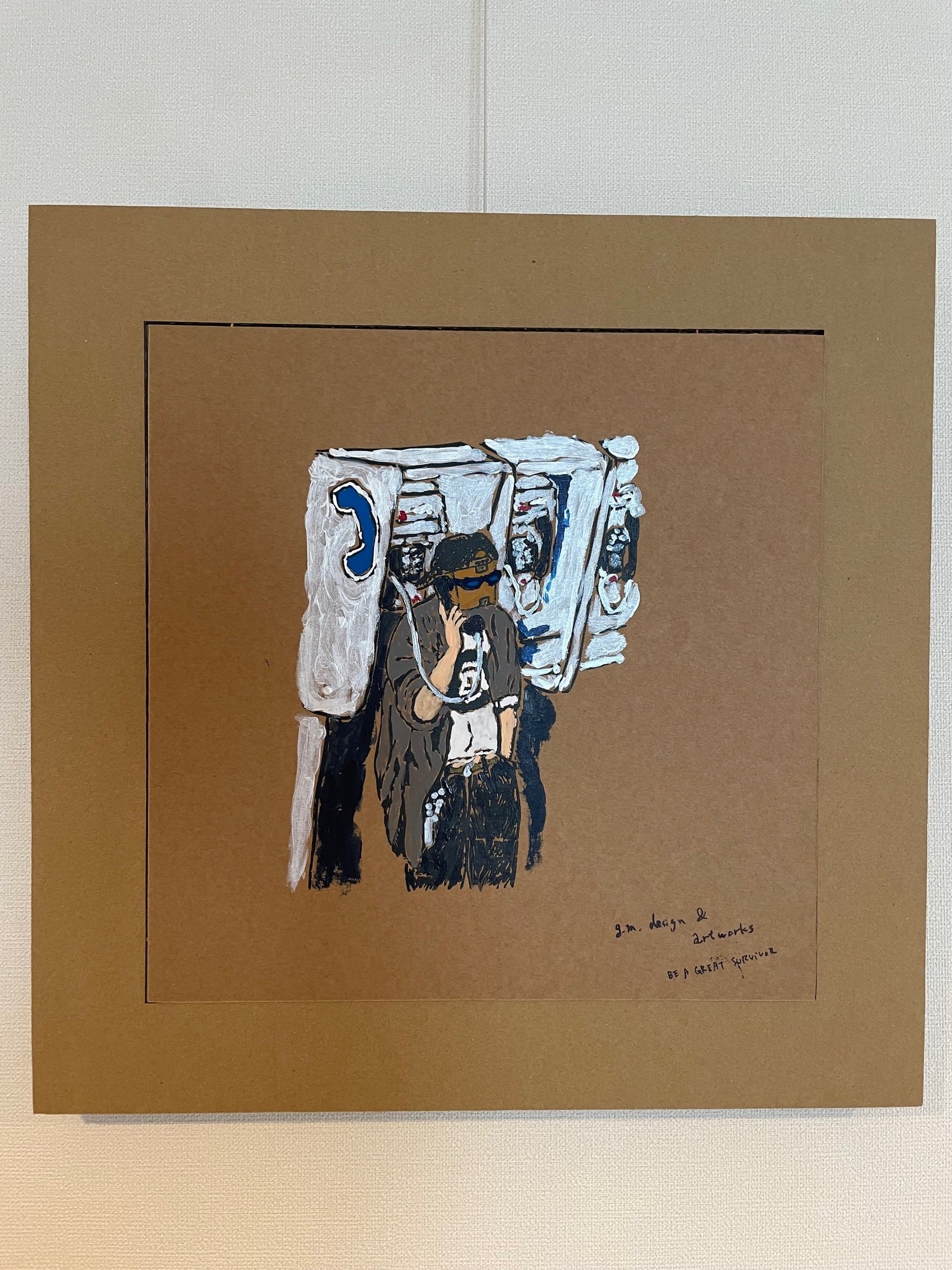 ダンボールアートフレーム 公衆電話でしゃべっているダンボールマン原画